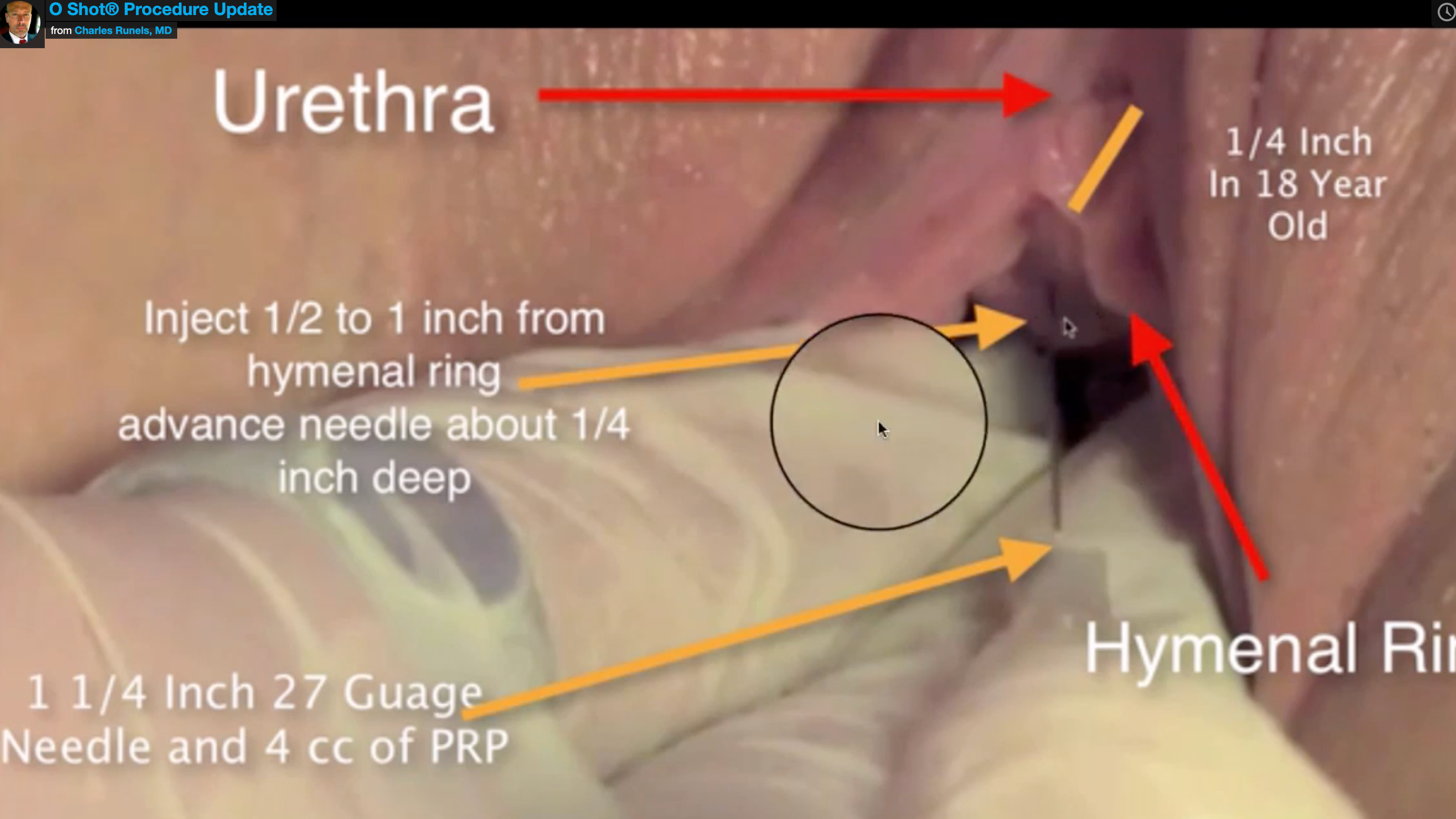 The following is a snapshot from one of our instructional videos showing one of the two injections the way we teach the O-Shot® procedure for SUI. By injecting the actual anterior vaginal wall, within a few millimeters of the hymenal remnant, you avoid the pain fibers within heart’s line, and you’re able to fill both the space between urethra and vagina and affect muscle, blood flow, and nerves. This can be done pain free or near pain free using the proper technique and only a topical cream for anesthesia.